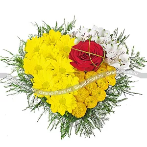Стандартный: роза розовая - 4 шт., роза розовая кустовая - 4 шт., эустома белая - 3 шт., альстромерия - 3 шт., гипсофила - 2 шт., гвоздика кустовая розовая - 3 шт., декоративная зелень, фетр желтый, оазис.